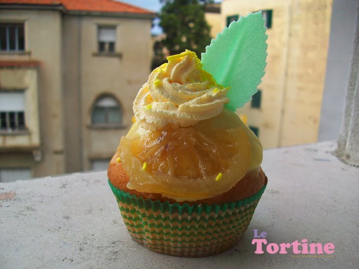 Per “attaccare” le fettine di limone caramellato sulla tortina ho usato un cucchiaio di crema pasticcera che ho spalmato sulla cupcake. Ho montato della panna “ingiallita” con alcune gocce di colorante per dolci arancio e ho fatto un bel ricciolo, poi ho aggiunto una spruzzatina di codette gialle e una fogliolina.