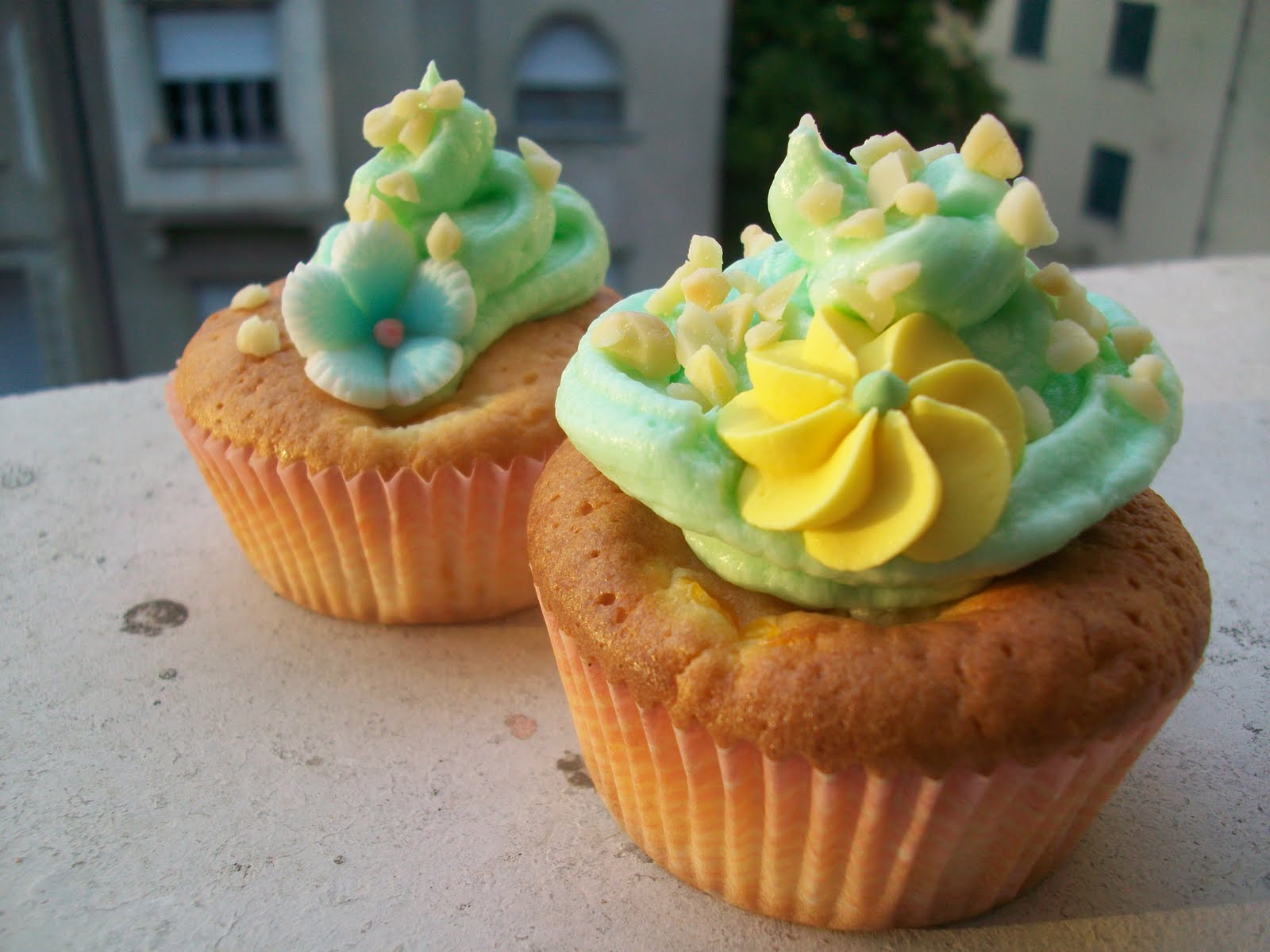 Per decorarle usate un classico frosting al Philadephia, tinto con qualche goccia di colorante verde, quanto basta per dargli un colore pastello e dei fiorellini di zucchero, ho aggiunto anche della granella di mandorle piuttosto grossolana.