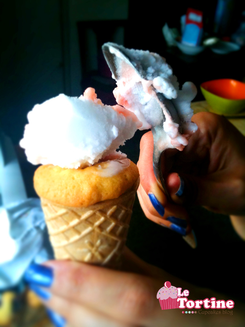 E adesso il tocco finale! Usate le vostre cupcake/gelato come un cono qualunque e farcitele con gelato al limone e alla fragola: lascerete tutti a bocca aperta..ops, volevo dire piena! 😉