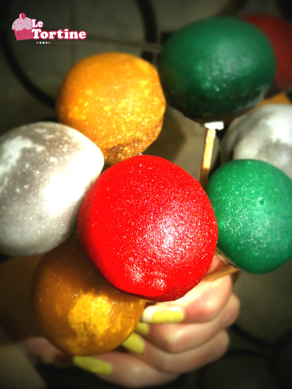 Step 8: adesso la glassa bianca è pronta! Per colorarla trasferita in ciotoline alte e aggiungete il colorante in polvere. Io ne ho lasciata un po’ bianca, e il resto l’ho colorata di rosso, verde e giallo. Immergete i cake pops nella glassa e ruotate bene, in modo da far uniformare lo strato colorato sulla loro superficie. Ci sarà bisogno di fare una “seconda passata”, in modo da rafforzare il colore: fatelo quando il primo strato sarà raffreddato.