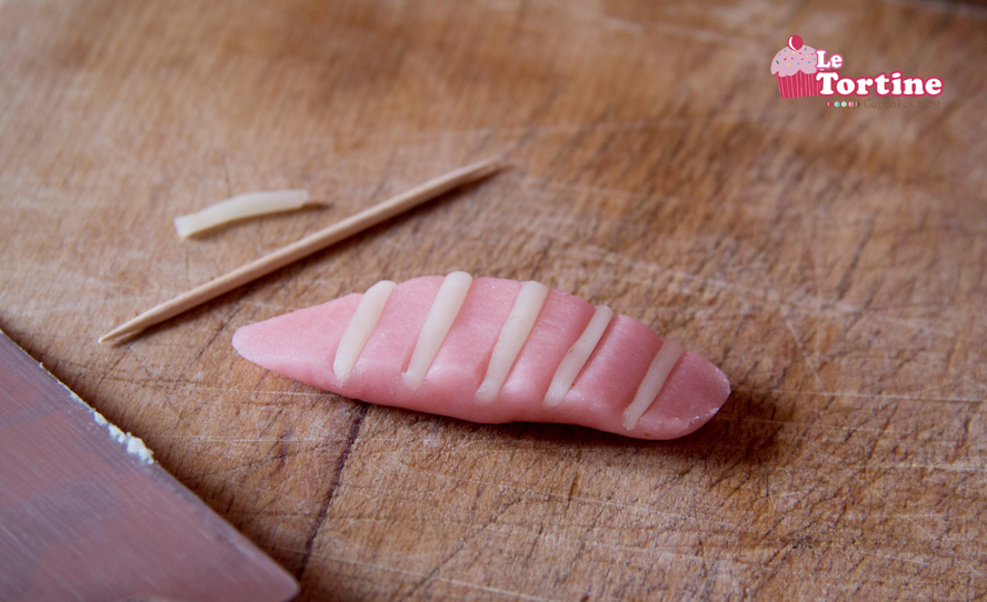 Step 5: Con del marzapane rosa (io l’ho trovato a Parigi), realizzate dei piccoli filetti di salmone, su cui cui farete dei piccoli intagli.