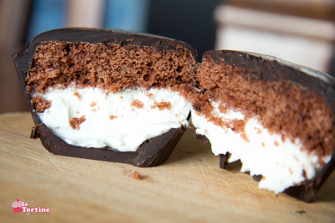 All’interno di queste cioccolatose cupcakes c’è un cuore di gelato al fior di latte, (un po’ come nella vecchia Bomboniera Algida, ricordate? Ecco un forum interessante che ci fa fare un salto nel passato, qui troverete anche la Bomboniera) e uno strato di pan di Spagna al cacao, una squisitezza!