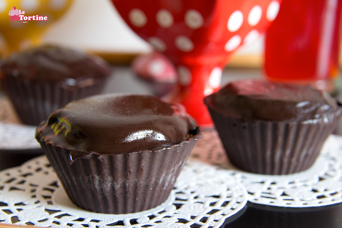 Step 8. Sciogliete a bagnomaria altri 100 gr di cioccolato fondente che andranno a ricoprire la parte superiore delle nostre tortine. Lasciatelo riposare per 10 minuti (non usatelo troppo bollente o colando rischierà di sciogliere il pirottino) e fatelo colare lentamente sulla copertura di pan di Spagna, stendendolo bene con una spatola. Man mano che le vostre cupcakes saranno complete, raffreddatele subito in freezer. Dopo un’ora sono pronte per essere gustate!
