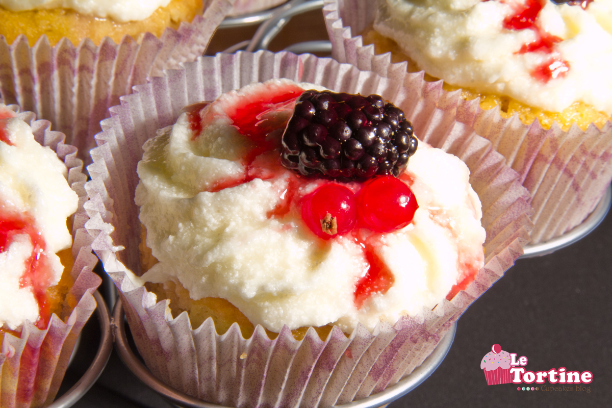 Ma su dai, non siate tristi! Se avete ancora voglia di vacanze ma siete state costrette ad abbandonare la spiaggia, approfittate dei week-end di sole che settembre ci regala e fate una bella gita in montagna, si trovano in giro tante more! Questa ricetta infatti, mi è stata ispirata da una passeggiata in montagna con gli amici. Ho scelto more, ribes rossi e uva spina (che contrariamente a quello che si può immaginare è una varietà di ribes dal chicco più grande, molto simile ad un acino d’uva) e li ho abbinati allo yogurt sia nell’impasto che nel frosting. Attente però, si tratta di un frosting delicatissimo, non eccedete con la grandezza del ricciolo altrimenti non reggerà il peso della frutta.