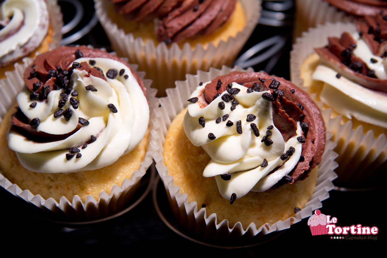 Si, lo so. Vi avevo promesso la base in versione Peggy Porschen, ma non ho resistito e ho rifatto le cupcakes alla vaniglia di Hummingbird. Volevo assaggiarle con bel frosting importante e goloso e ce l’ho fatta. Ho preparato due frosting; uno al cioccolato bianco e l’altro al cioccolato fondente e con la scusa ho sperimentato una tecnica appresa qualche tempo fa su internet che ci permette di fare un ricciolo bicolore inserendo due sac à poche piccole in un’altra più grande per tenere i colori ben separati. Deliziose…