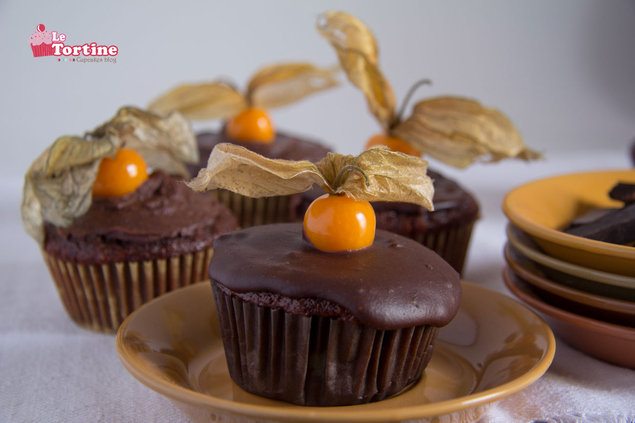 Eccoli qua i mitici alchechengi, quel frutto strano dalle foglie svolazzanti che campeggia sempre sui dolci fighi! Cercava di nascondersi tra i manghi e i pomodori ma io l’ho trovato e acquistato senza batter ciglio. Innanzitutto ero curiosissima di assaggiarlo e poi non mi sarei mai persa l’occasione di usarlo sulle cupcakes. L’abbinamento classico con l’achechengi è quello col cioccolato, soprattutto il fondente, e questo mi ha permesso di preparare un’ottima ganache per frostare le tortine.