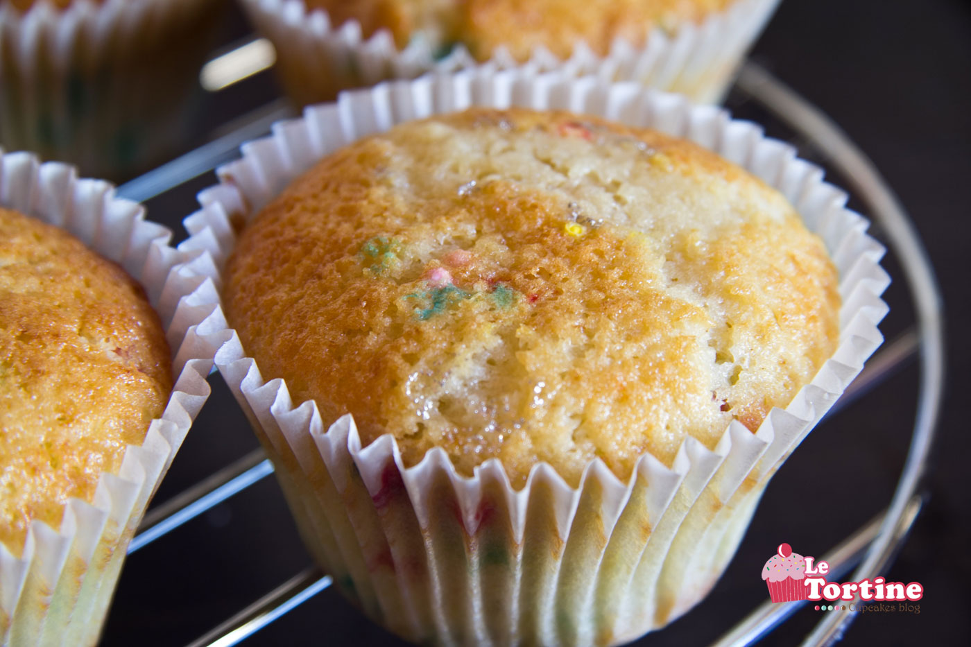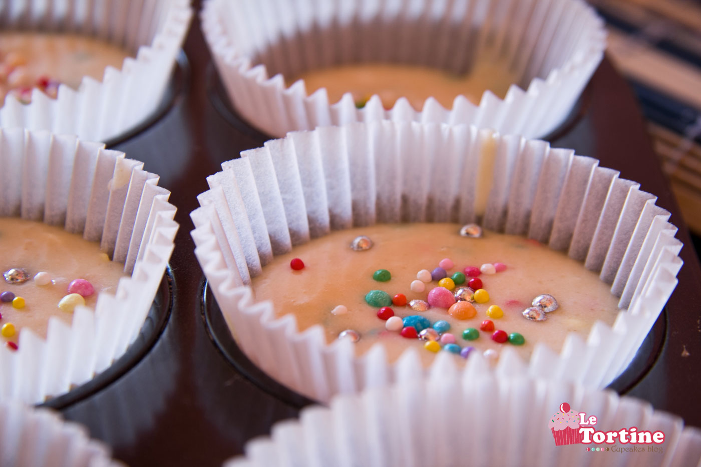 Ricordate di aggiungere altri sprinkles sull’impasto nei pirottini, come vedete in foto. Se vi sembreranno troppi, non preoccupatevi: l’effetto finale deve essere super colorato!