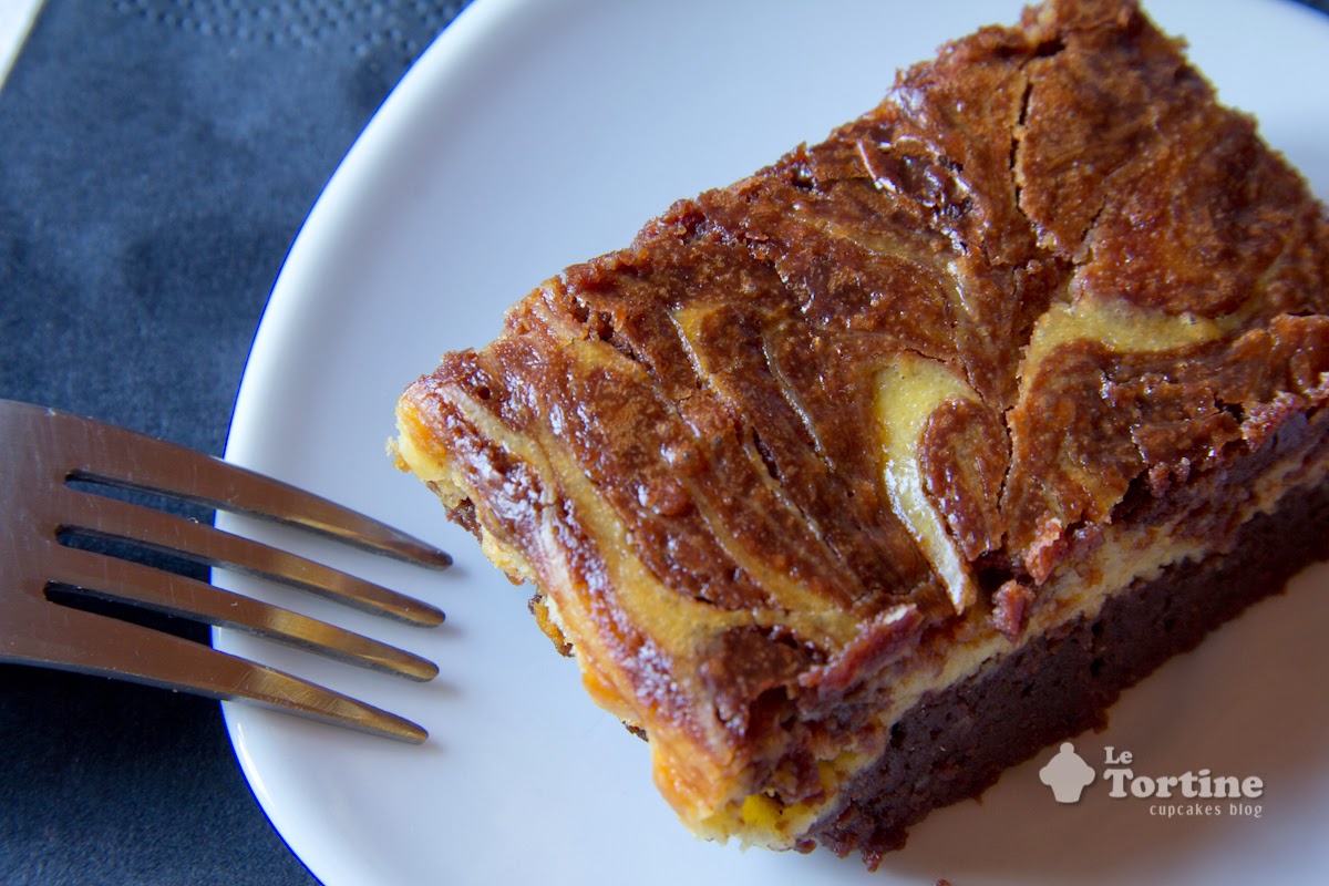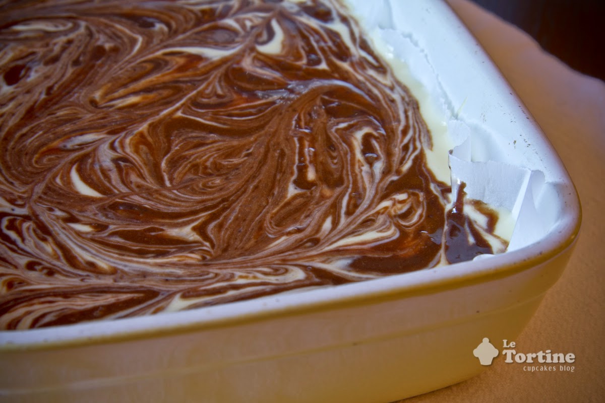 Mettete 2/3 del composto al cioccolato nella teglia, copritelo con la crema bianca e spargete a cucchiaiate il restante composto al cioccolato.
