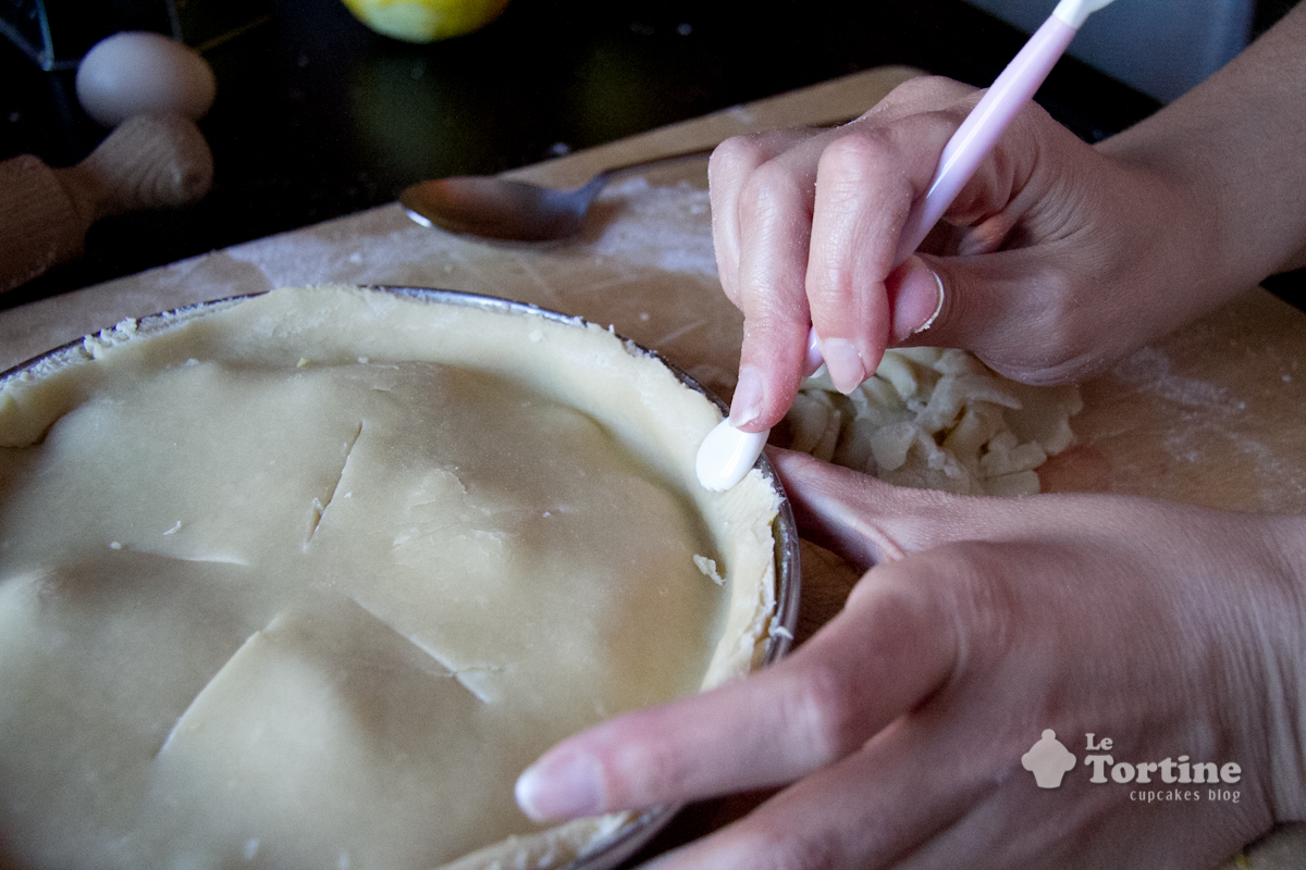 Coprite la pie col secondo disco di frolla, praticate dei tagli al centro dell’impasto che permetteranno al succo di uscire e unite i due strati di frolla premendo i bordi uno contro l’altro. Potete usare i rebbi di una forchetta, io ho degli attrezzi per modellare la pasta di zucchero e ne ho usato uno che ha impresso alla frolla un motivo a conchiglia.