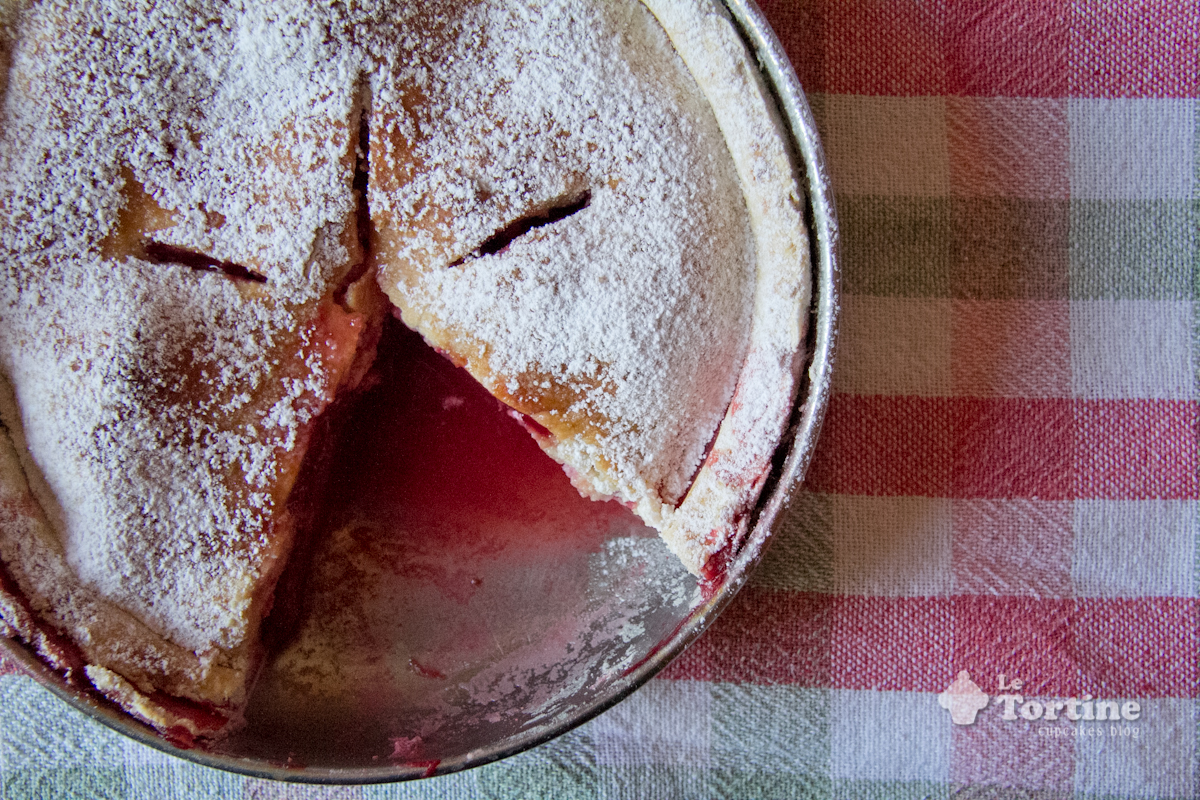 Nonna Papera, non ti temo più! Se prima le tue torte erano un dolce e oscuro mistero, ora posso sfidarti, che ne dici di questa pie alle fragole?Devo però svelare un piccolo retroscena chiedendo consiglio a tutte/i voi.In origine questa pie doveva contenere anche dei tocchetti di rabarbaro fresco (abbinamento classico), ho dovuto però rinunciare all’ultimo momento perchè il rabarbaro aveva un cattivo odore, acre e molto forte. Perchè? Considerate che il rabarbaro lo coltivo in giardino e che le mie piante hanno due anni.