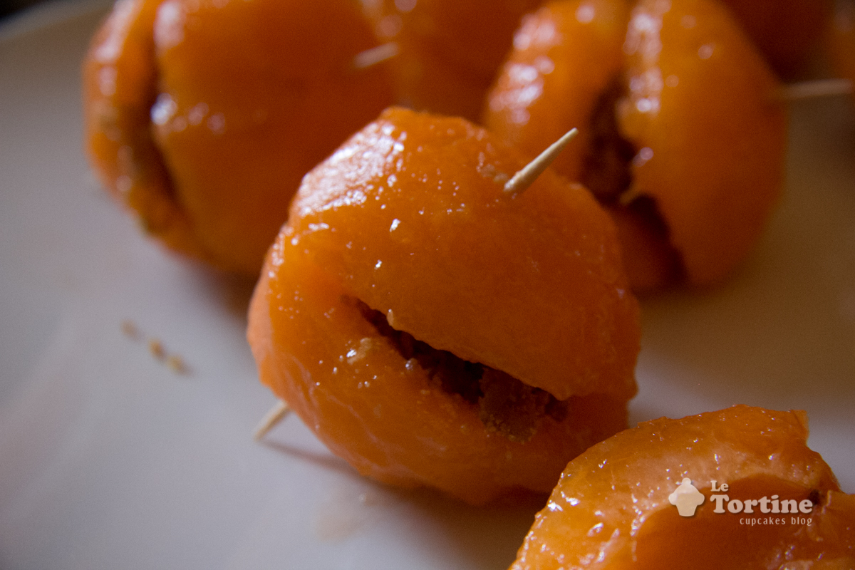 Amalgamate gli ingredienti, poi mettete un cucchiaino del composto preparato al centro di una mezza albicocca, appoggiatevi sopra un’altra mezza albicocca e fissate le due metà con uno stuzzicadenti.