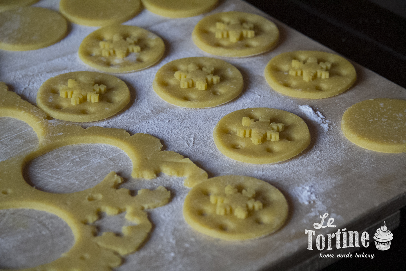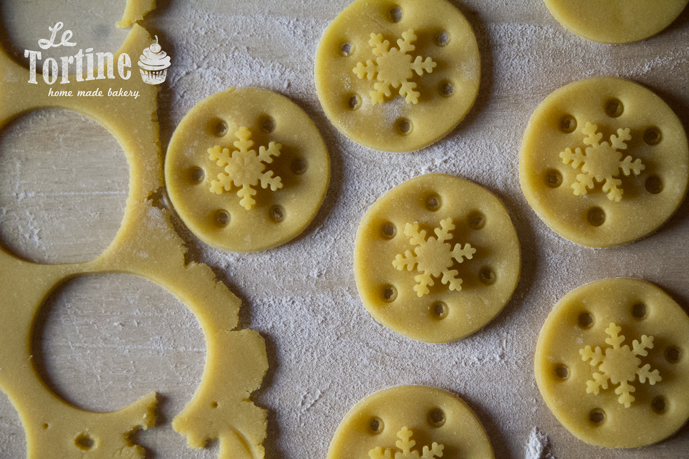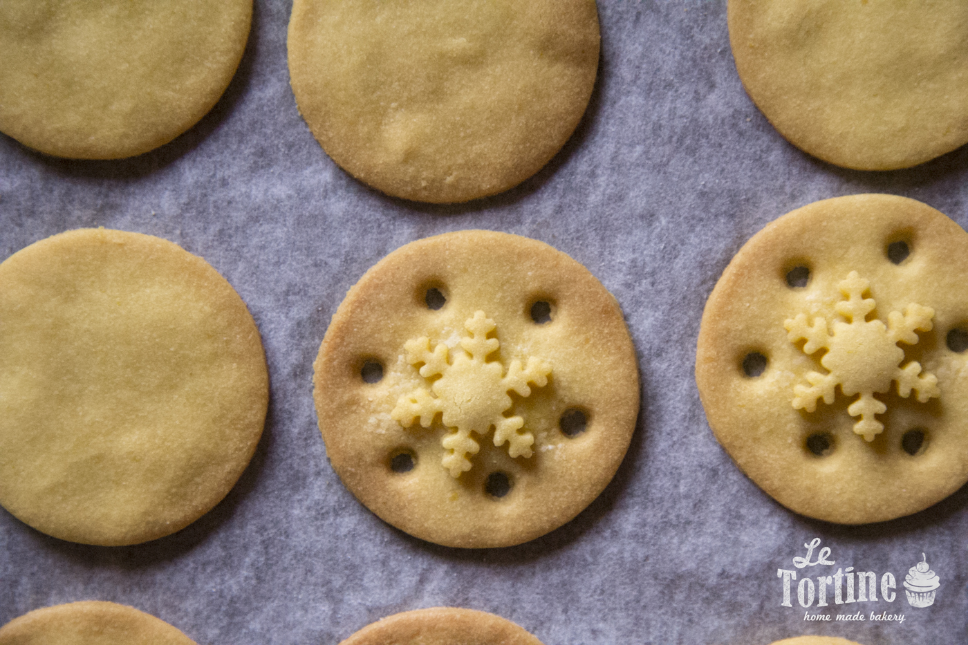 Dato che i biscotti andranno accoppiati e farciti con una crema, potete decorarli praticando dei fori per renderla visibile, come vedete in foto, oppure con dei motivi a rilievo, a seconda dell’attrezzatura e le forme che avete. Io avevo dei piccoli stampi ad espulsione a forma di cristallo di neve, perfetti per decorare dolci nel periodo più freddo dell’inverno.